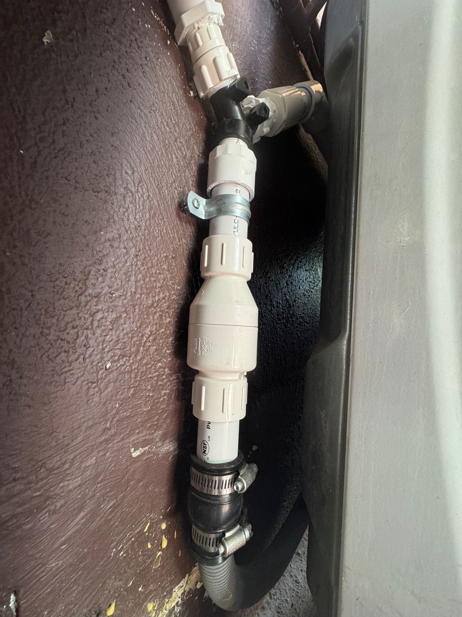 Once I had all the parts, I used the rubber coupling to connect the wash drain into a short 1" PVC pipe. That pipe was then connected to a 1" check valve that prevented water from flowing back into the washer. That valve was then connected to another short 1" PVC pipe. The 1" PVC to garden hose male adapter was added after (the black plastic part in the photo). From here and on both sides of the Y adapter, I used PVC connectors to go from garden hose thread back into a 1" PVC line. Lastly, I used the PVC clamps to ensure that the whole structure was stable and in place.